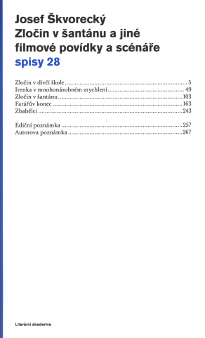 Zločin v šantánu a jiné filmové scénáře a povídky ze šedesátých let.Edičně připravuje Michal Přibáň. Bude obsahovat filmovou povídkuZbabělci a scénáře Zločin v dívčí škole (jen titulní povídku), Zločinv šantánu, Farářův konec a Irenka v mnohonásobném zrychlení. 28. svazkem Spisů Josefa Škvoreckého se autor čtenářům představuje jakofilmový scenárista. Přestože jeho zájem o film je dlouhodobý, autorskymohl Josef Škvorecký české kinematografii zásadně přispět pouze vkrátkém období druhé poloviny šedesátých let. Pro knižní vydáníjsme vybrali scénář titulní povídky filmu Zločin v dívčí škole, dálescénáře filmů Zločin v šantánu a Farářův konec, a také nerealizovanýscénář Irenka v mnohonásobném zrychlení, první společné dílo manželůŠkvoreckých. Tyto čtyři scénáře doplňuje filmová povídka, resp. spíšejen synopse zamýšleného filmu podle románu Zbabělci, který autor v roce1968 připravoval spolu s režisérem Milošem Formanem, jehož realizacivšak zřejmě navždy znemožnila sovětská invaze.