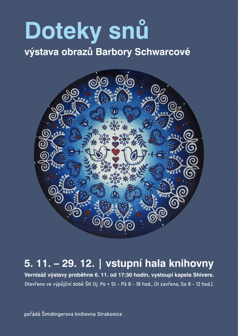 5. 11. – 29. 12. Výstava ve vstupní hale ŠK. Otevřeno ve výpůjční době ŠK (tj. Po + St - Pá 8 - 18 hod., Út zavřeno, So 8 - 12 hod.).