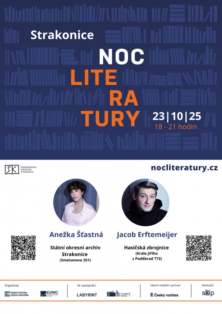 Unikátní propojení neobvyklého místa, osobité interpretace a literárního textu nabízí nevšední kulturní zážitek. I letos se připojujeme k celorepublikové akci. Ukázky z knih současných evropských autorů budou číst herci ANEŽKA ŠŤASTNÁ a JACOB ERFTEMEIJER.