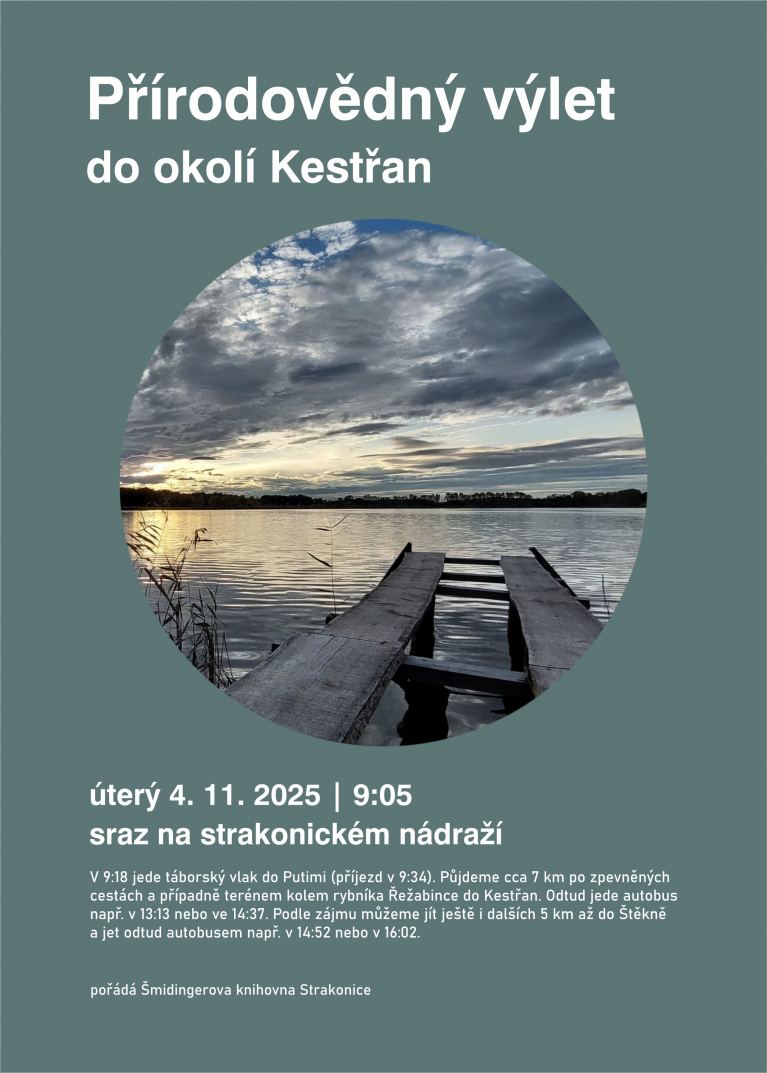 V 9:18 jede táborský vlak do Putimi (příjezd v 9:34). Půjdeme cca 7 km po zpevněných cestách a případně terénem kolem rybníka Řežabince do Kestřan.